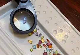 Cold enamel · Resin · Hand-painted pigment · Gradient and translucent effects.